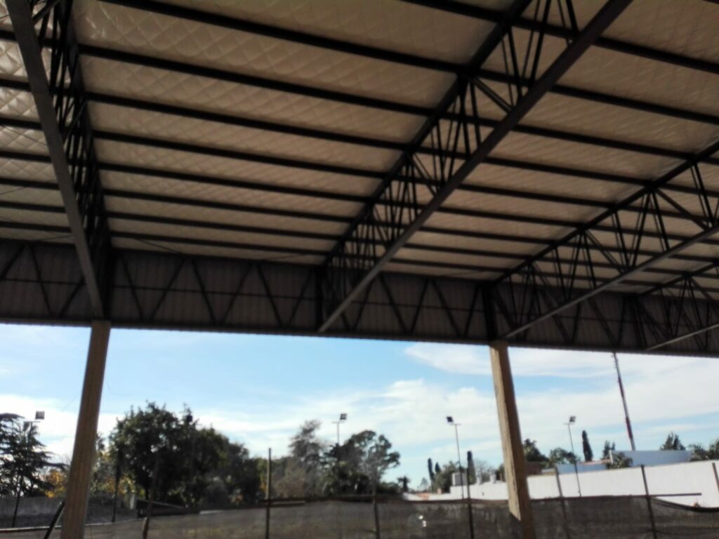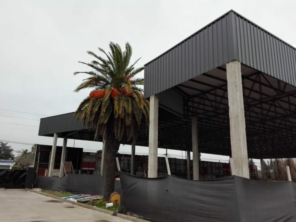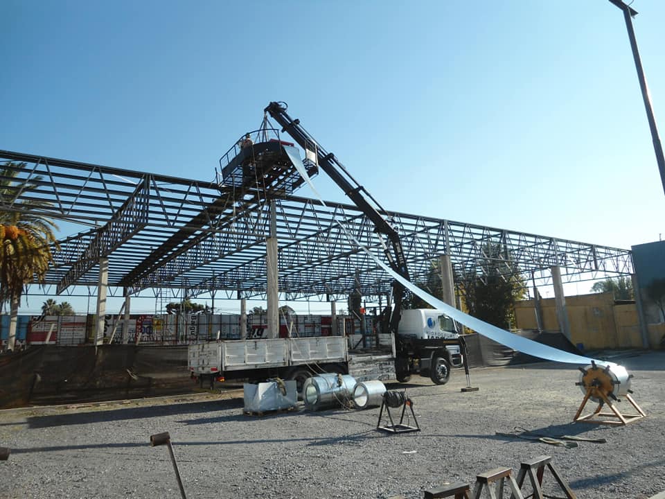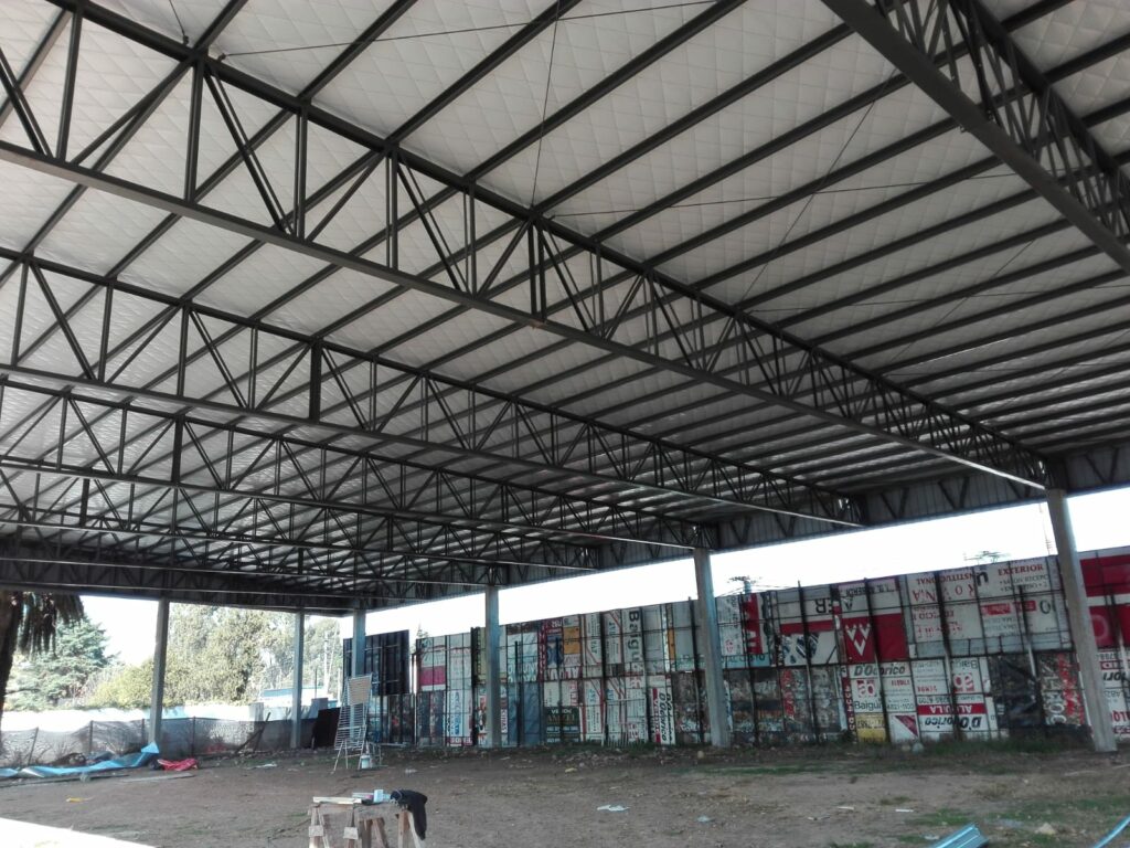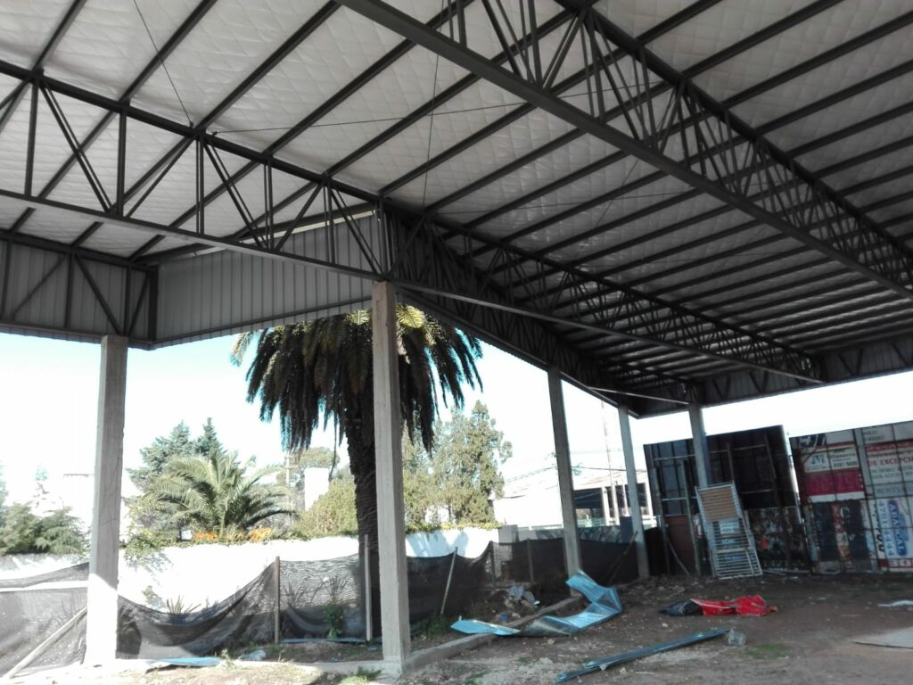 Nave a un agua de 30,00 mts de frente por 46,00 mts de largo, viga de apeo perimetral evitando columnas intermedias, generando luces de 11,50 mts, pendiente mínima y chapa conformada en obra U45. Cerramiento perimetral ocultando la cubierta en chapa color negra.